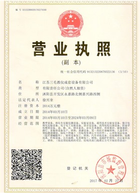 江蘇三毛教儀成套設(shè)備有限公司是一家集設(shè)計、生產(chǎn)、銷售、售后為一體的大型制造企業(yè)。坐落于風景秀麗的花木之鄉(xiāng)、全國經(jīng)濟百強縣、國家級經(jīng)濟開發(fā)區(qū)沭陽縣永嘉路。